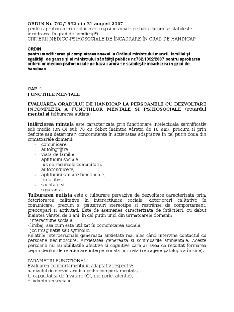 Criterii medico psihosociale de încadrare în grad de handicap din 31 august 2007 capitolul 1. Potrivit noilor criterii de încadrare handicapul grav de acordă pentru întârzierea mintală profundă nivel qi sub 20 25 scor gafs 21 30 grav fără asistent personal scor gafs 1 20 grav cu asistent personal minimă dezvoltare senzitivo motorie pacientul reacţionând la comenzi simple îndelung executate având nevoie de asistenţă permanentă şi fiind incapabili de. Este vorba despre modificarea ordinului nr. 762 1 992 2007 incadrarea in grade de.
