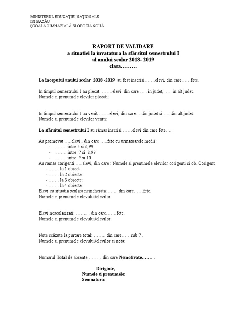 Raport De Validare Diriginte Sem I Slobozia Nouă